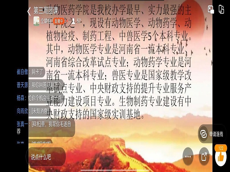 在本次团课中,各班主持人搜集相关内容,精心制作团课PPT,为本次团课顺利进行奠定了基础。团课伊始,团课主持人组织广大学生收看“河南牧业经济学院青年之声”校庆日专题栏目:【青Vlog】让我们的大学生熠熠生“徽”。让青年学生特别是新生增进对学校的了解,培养“主人翁”意识,激发学生的学习热情和奋进力量,共建和谐校园。在学习中,同学们认识到要增强大局意识、责任意识、担当意识和参与意识,秉承校训,从我做起,形成人人为校出力,营造最佳的校园氛围。而后主持人向同学们举出了一些我们学校历年优秀的毕业生,呼吁同学们认真学习,向优秀的学长学姐看齐,激发同学们的学习热情和奋进力量。最后,各班同学纷纷表示要学好我们的知识,为社会做贡献,我们爱校,荣校就必须要立志成才,进入社会的我们代表的不仅仅是自己,更是代表着我们母校的形象。