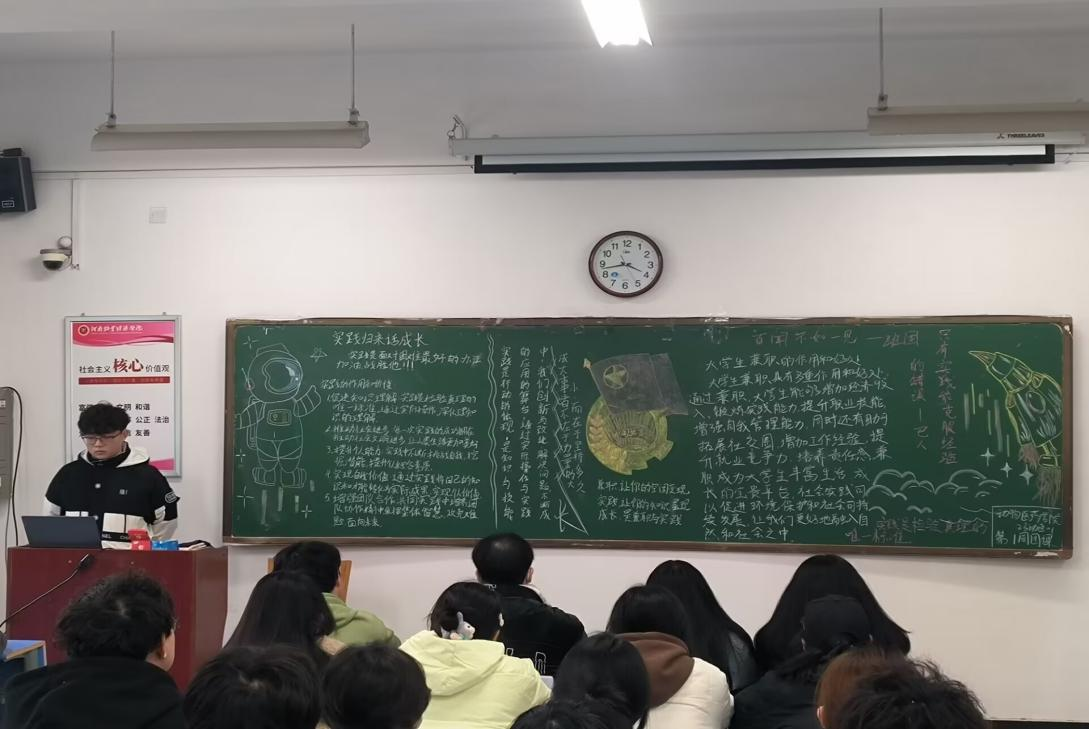 团课伊始,主持人首先对同学们的寒假社会实践情况进行了简单的汇报,总结和探讨了此次社会实践活动的意义和收获。通过实践学生们可以拓展自身的知识面,扩大与社会的接触面,增加个人在社会竞争中的经验,锻炼和提高自己的能力。随后,个别同学分享了自己的实践经历。在团课的最后,团支书根据本班寒假社会实践情况进行优秀实践报告评选,并对优秀作品进行分析和评价,强调了同学们应在投身实践中了解国情、关注民生、奉献社会。