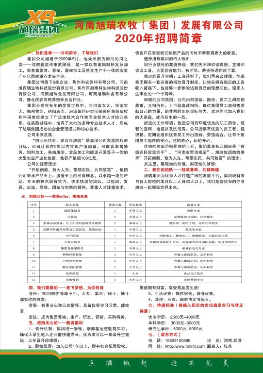 河南旭瑞农牧(集团)发展有限公司2020年招聘简章