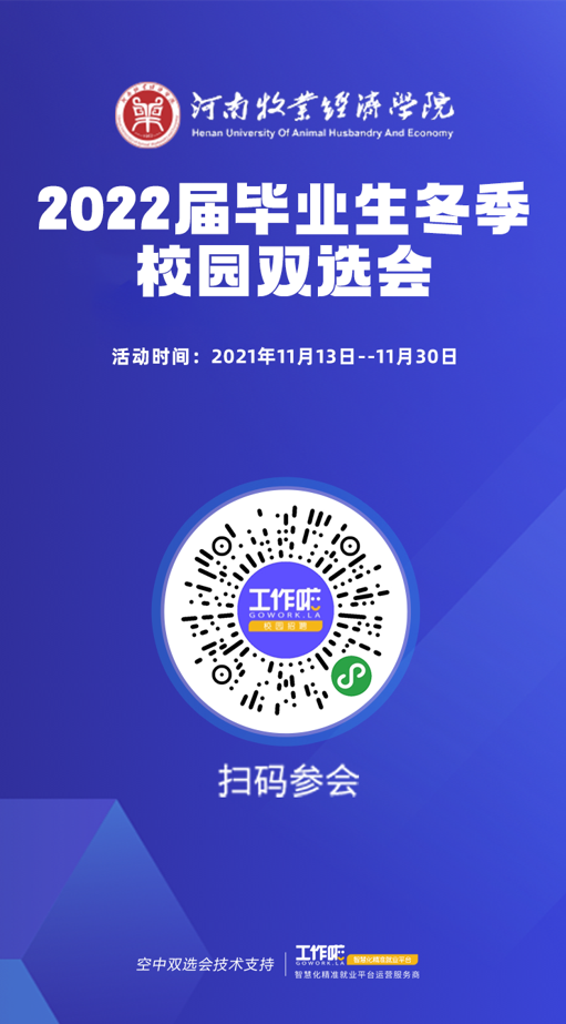 河南牧业经济学院2022届毕业生冬季校园双选会,因疫情原因改为线上进行,从11月13日开始到11月30日,线上会场正式开始,可以通过微信扫码参与。