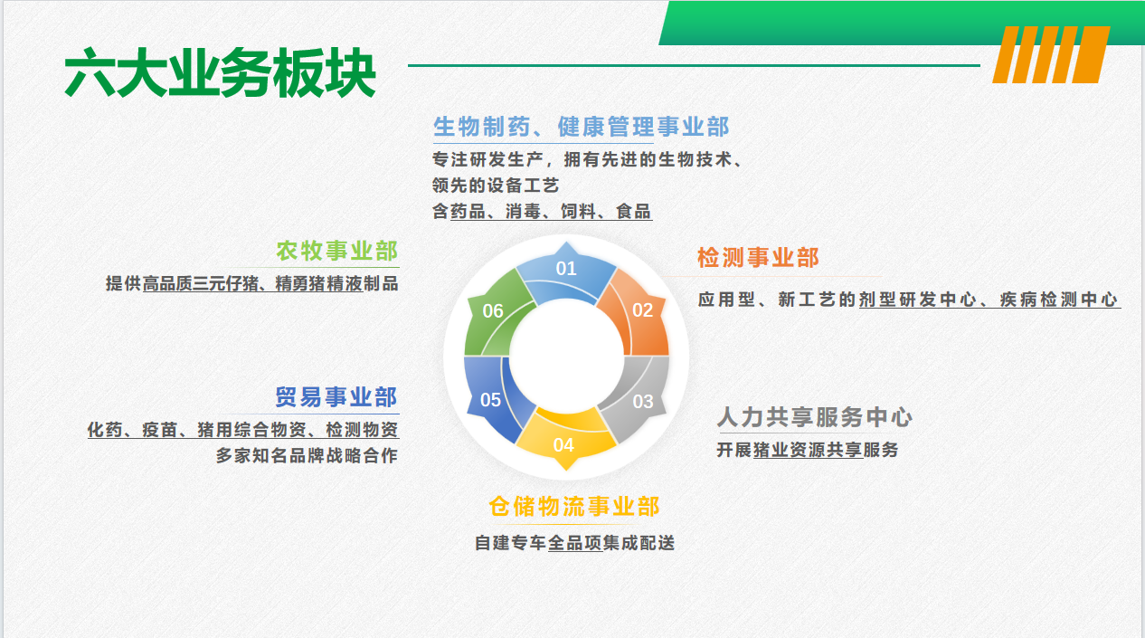 1、公司下设六大版块:生物制药/健康管理、检测、农牧、贸易、仓储物流中心、人力共享服务中心。