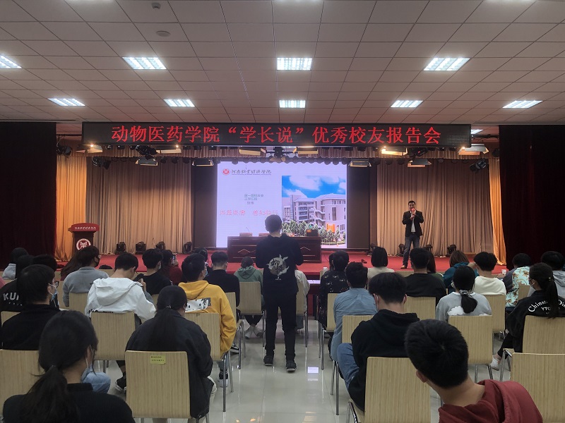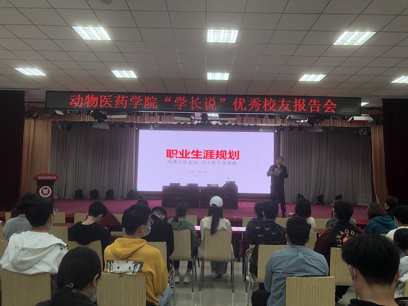 11月7日15:00,我院于大学生活动中心四楼举行了“学长说”优秀校友报告会,学院特邀郑州格外文化传播有限公司董事长肖林、河南牧翔动物药业有限公司市场总监曲玖燕、北京世宠生物科技有限公司总经理张伟作为优秀校友代表担任主讲人,学院团委副书记聂丹和240余名学生共同聆听了此次报告。