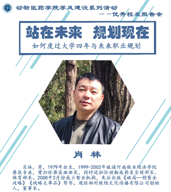 报告会开始,肖林学长回忆起他在河南牧业经济学院就读时学习生活的点滳,通过列举各种学生进入大学后的表现引入主题:站在现在,规划未来。他强调大学生要把长期目标与短期目标相结合,充分利用时间,为大学生活增光添彩,并向同学们列举了大学生在大学应干的13件事,如独立思考、学会自律、建立优质的人际关系等。肖林学长也给同学们提出了两条要求,以告诫其不可荒废美好时光,一是大学生要做好该做的事,二是尝试探索自己的职业方向。同时,肖林学长鼓励大学生坚持不懈投身社会实践,锤炼自身品性,增长自身才干。报告会最后,肖林学长介绍动物医药行业发展现状以及自己的工作日常,并为同学们解答了包括如何在求职面试获得更大的优势、升学还是工作、学习方法等重要问题,取得热烈反响。