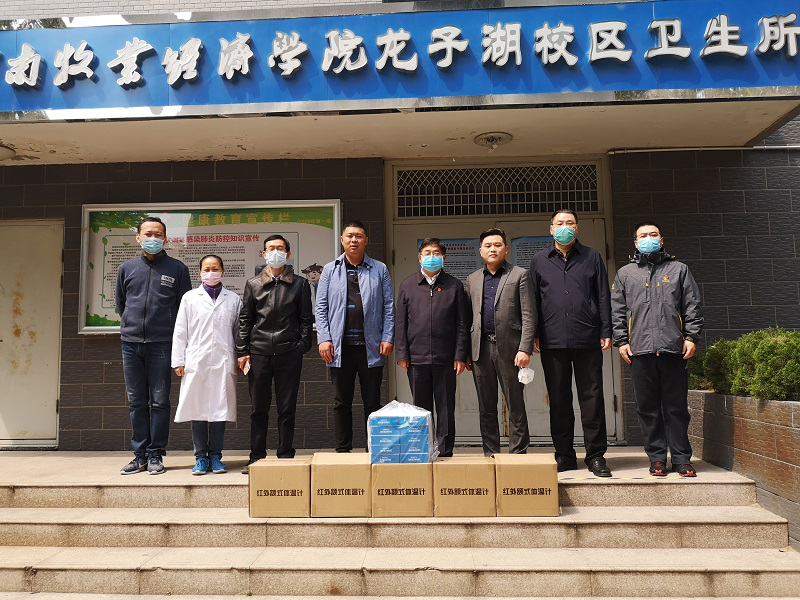 4月9日上午,河南绿之源检测技术有限公司董事长王红岗、总经理张林峰代表公司向学校捐赠的红外额式体温枪100支。校长罗士喜、社会服务办公室主任胡迎利、太阳成集团tyc33455班子成员和校医院负责人代表学校接受了捐赠。