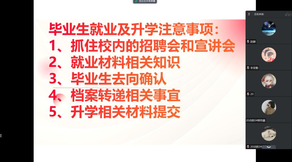 为了更好地服务2024届毕业生,帮助他们更好地了解就业形势、明确个人职业定位、树立正确的择业观与就业观,太阳成集团tyc33455于10月15日线上召开了一场毕业生就业创业指导会,分别就就业政策、求职技巧和创业指导等方面为毕业生进行了详细解读和分析,本次会议由学院就业专干赵赫主持,24届毕业生各班学生代表参会。